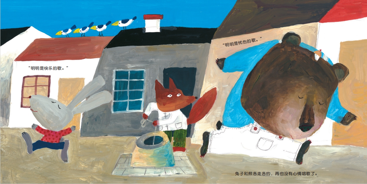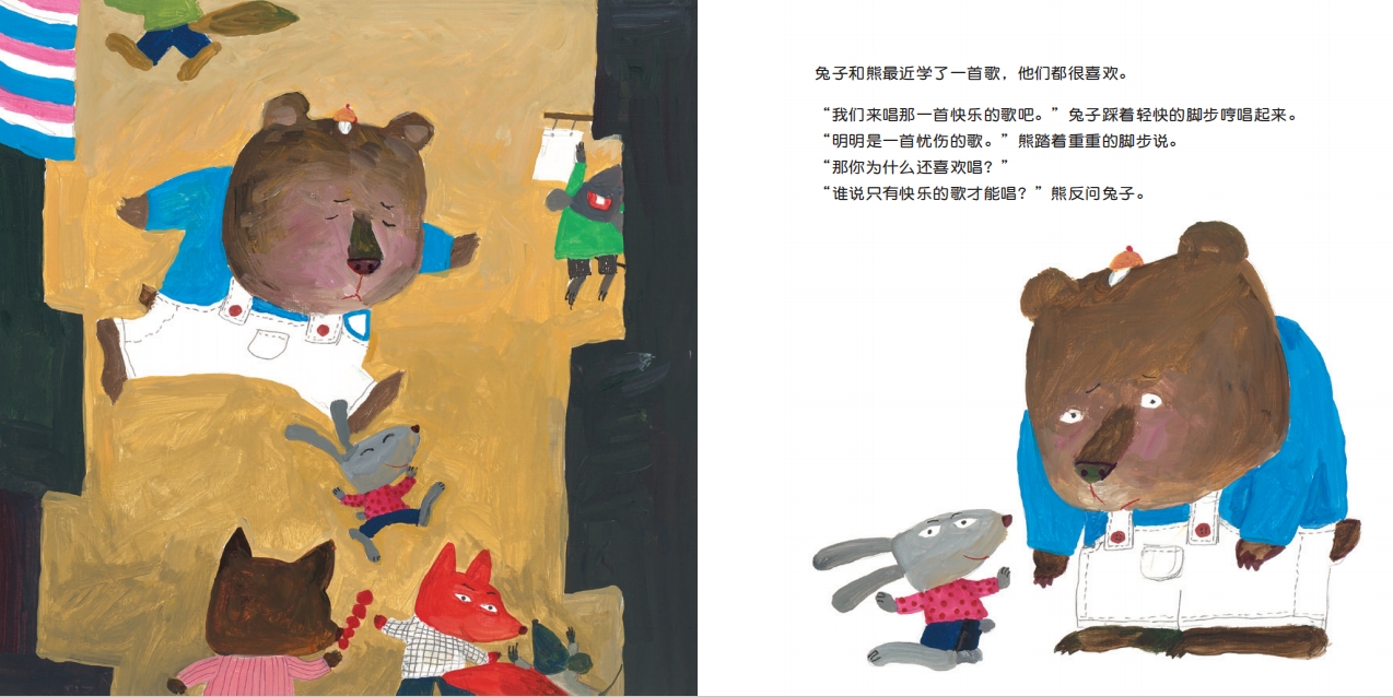 《你怎么说,鸭子?》是一部难得的幽默作品,同时又包含让人心头一热的深情厚谊。作者以熊和兔子两次去问鸭子的不同心境,笔力集中、结构紧凑地展开矛盾的升级与和解的过程,细腻地展现角色内心的风云变化。画者以色彩鲜明的丙烯颜料简洁地展现一部轻喜剧,以稚拙的笔法描绘角色的姿势与表情,生动地传情达意。
